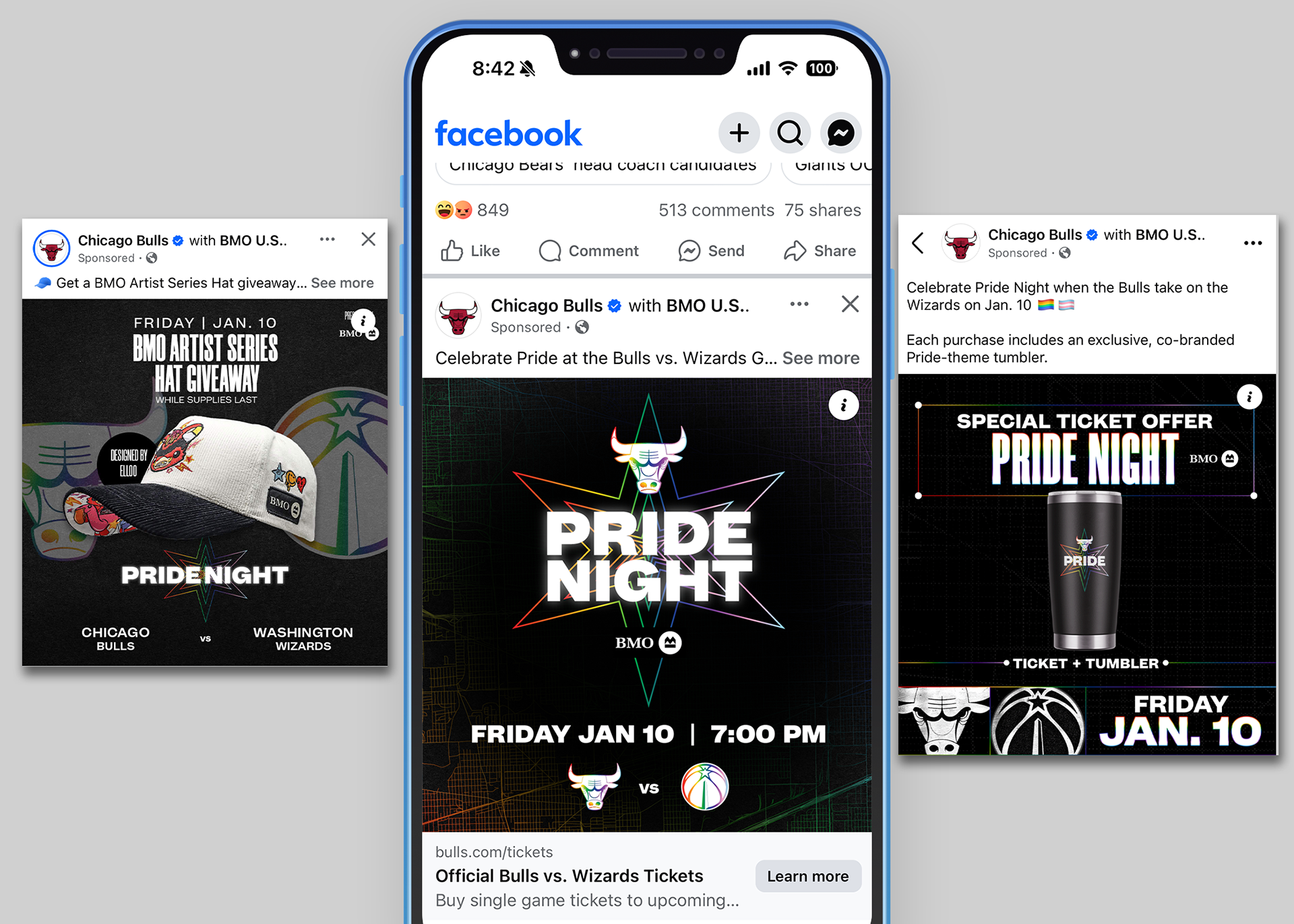 For the 7th annual year, the Chicago Bulls and sponsor BMO celebrated the LGBTQIA+ community starting with a Pride Basketball Clinic in December, Pride Night game in January, and Chicago Pride Parade Float in June. I'm proud to have designed and directed the new identity across digital and social that would last multiple seasons.