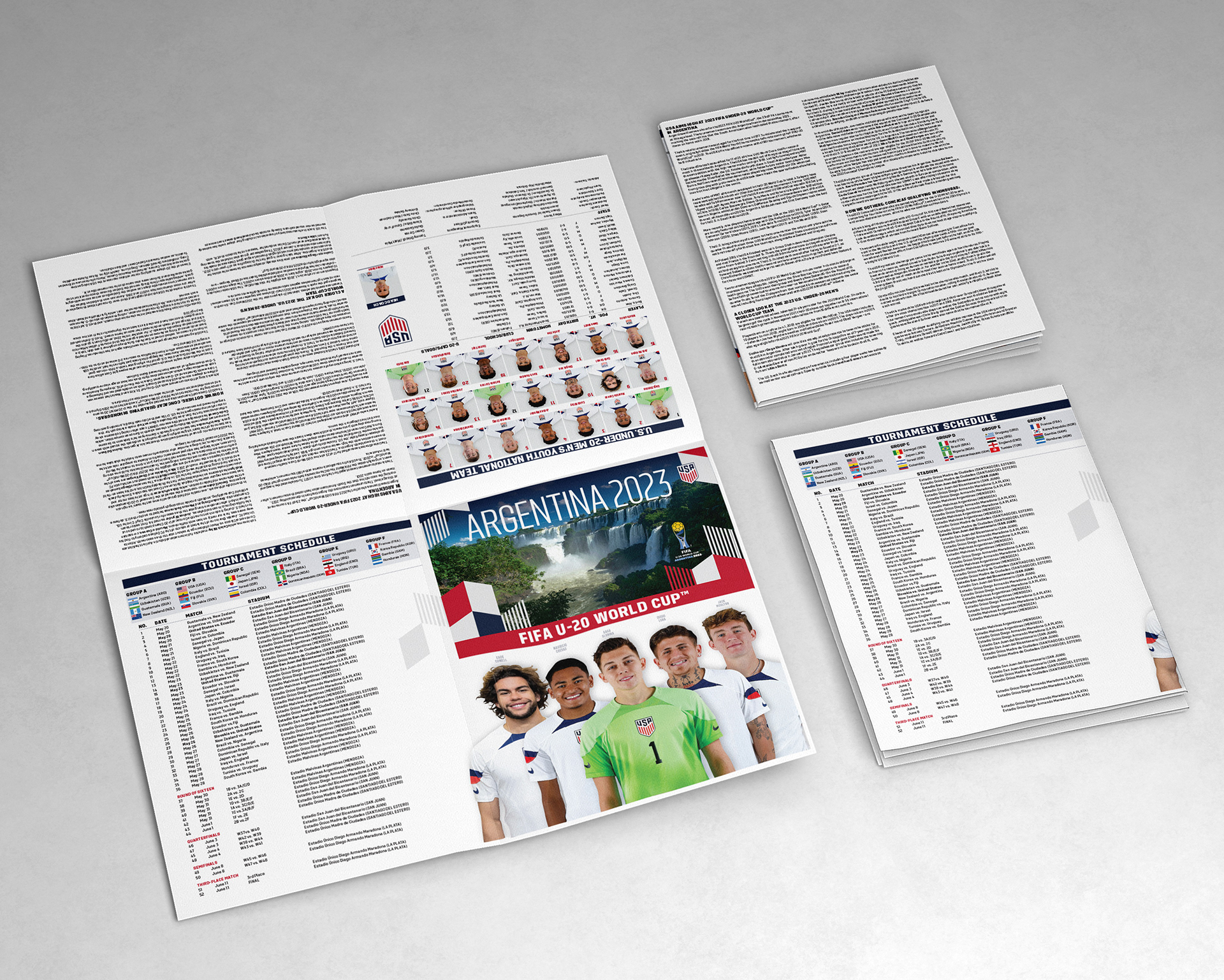 In preparation for the U.S. Men's Youth National Team's appearance in the 2023 Argentina World Cup, I designed the multi-fold media guide poster and digital guide for the U.S. Soccer Federation to distribute to broadcast partners and attendees featuring an overview of the team.